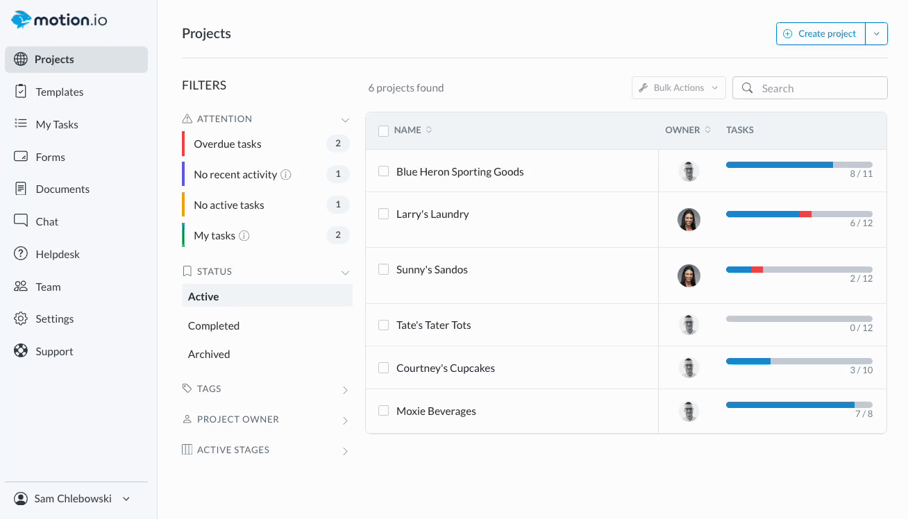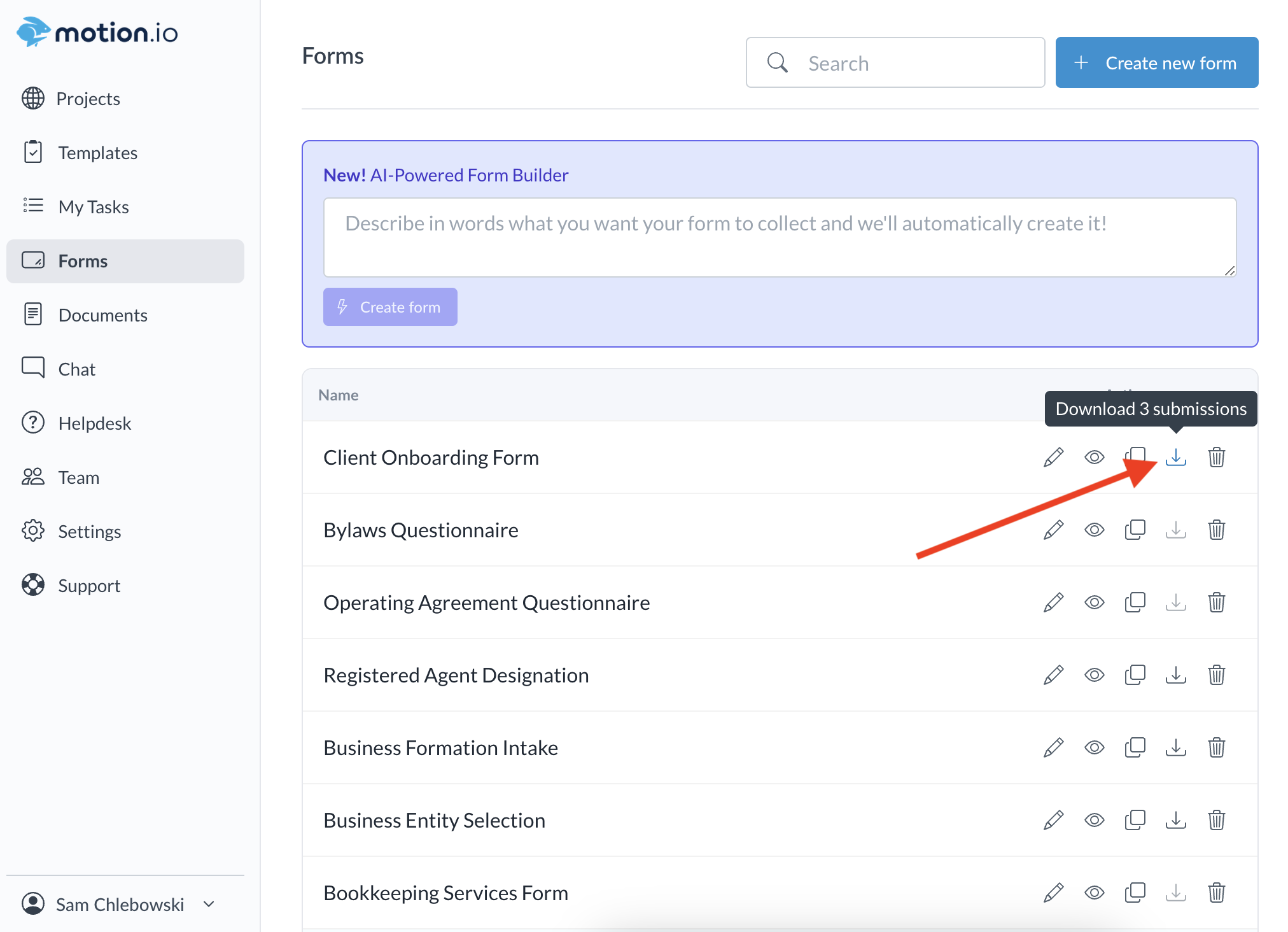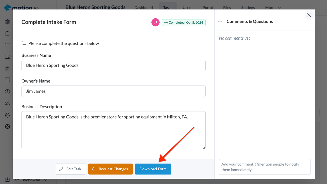 Using Motion.io's drag-and-drop form builder, you create custom forms and attach them to tasks to streamline your process of collecting client files and information. This article will explain how to view completed form submissions in Motion.io and the options for downloading and exporting form submission data.