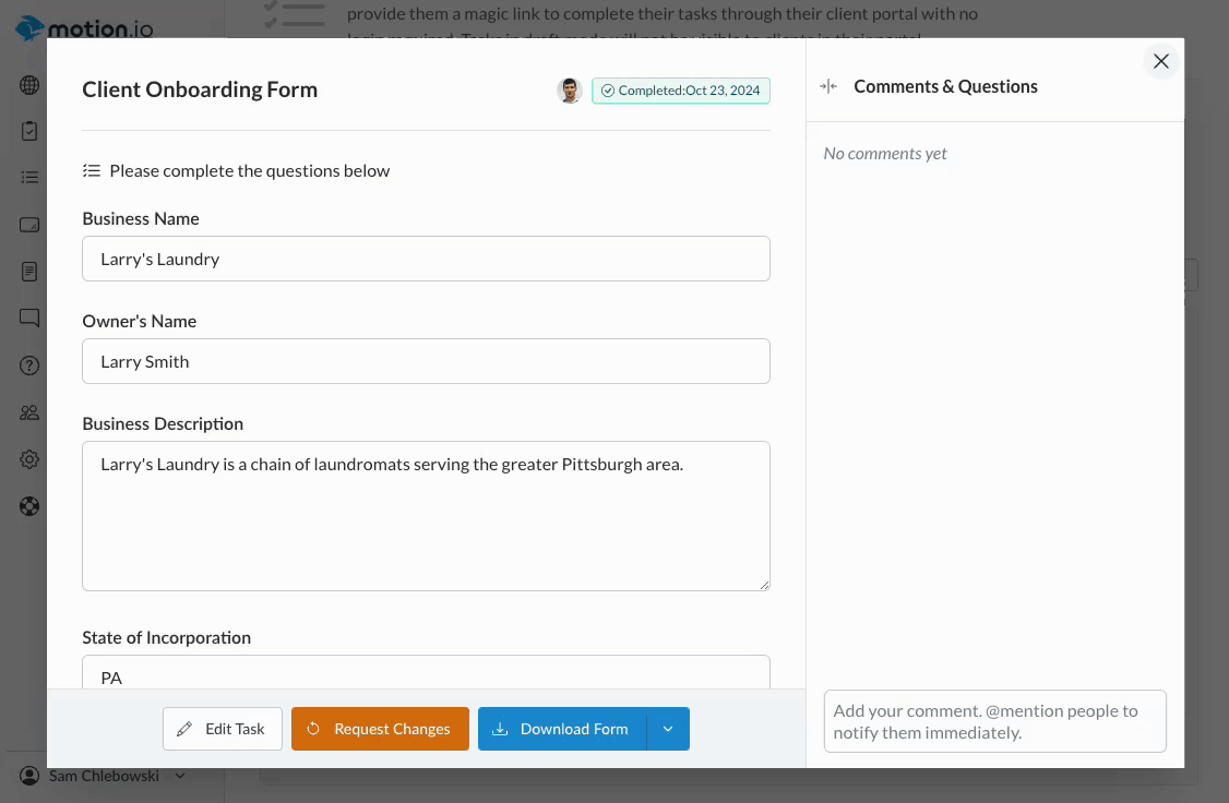 👋 Tip: If clients mark a task where you attached a form as "Complete" but fail to provide all of the information you need, you can send it back to them by clicking the "Request Changes" button. Click here to learn more.