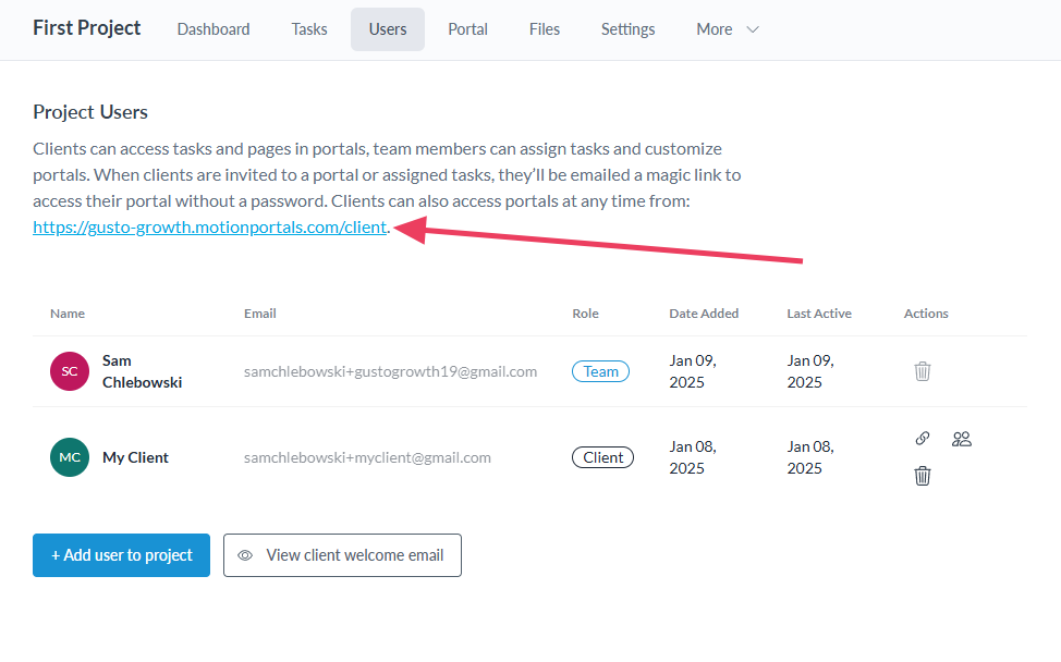 🏆 Tip: The default URLs for Client Login Pages are yoursubdomain.motion.io/client for magic link portals and yoursubdomain.motion.io/client-login for password-protected portals. If you upgrade to Motion.io's Enterprise plan and configure your white-label settings, these links will automatically update to your custom domain.