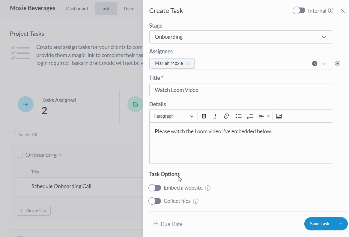 After entering a title (required) and description (optional) for your task, toggle on the “Embed a website” task option. Paste the embed code you copied from Loom into the open modal and click “Save.”