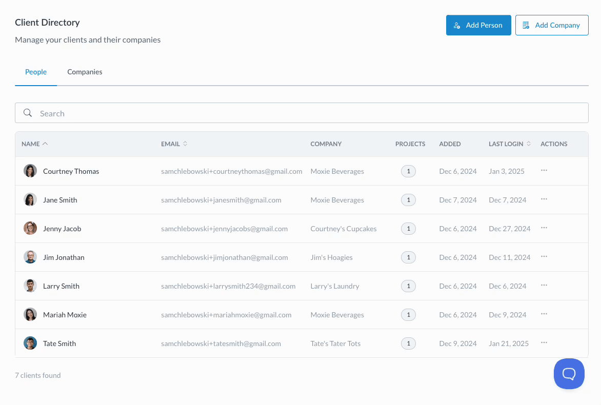 To create a new client, click the "Add Person" button in the upper right corner. In the modal, enter the client's details. After clicking "Save Person" the client you entered the details for will automatically receive an email with a magic link that allows them to access their portal.