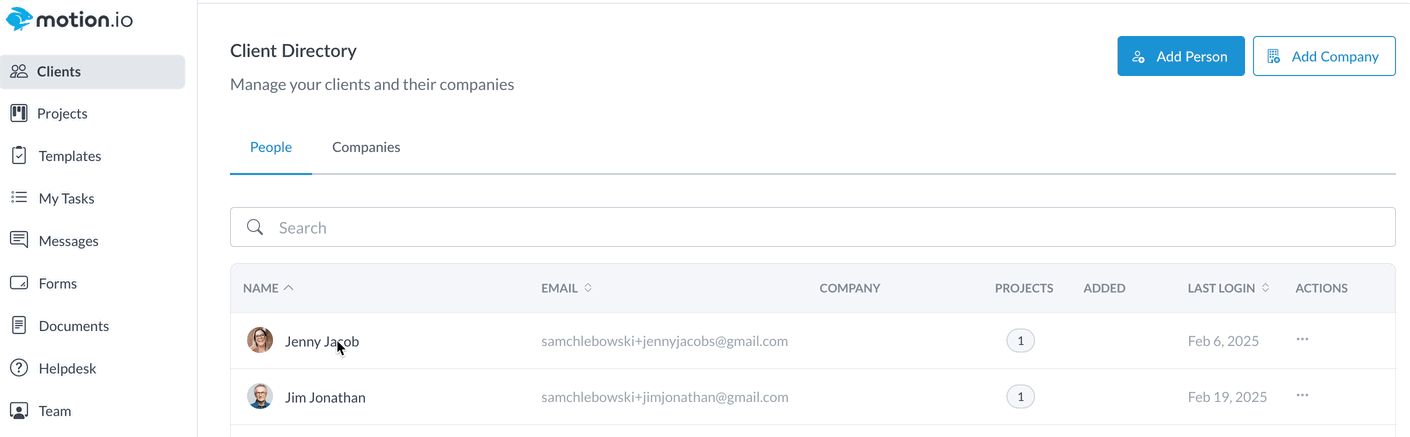 When you invite clients to projects, Motion.io will automatically add them to the "People" tab of the CRM. If you'd like to add clients to the CRM and give them access to their portal before inviting them to a project, Motion.io allows you to do so.