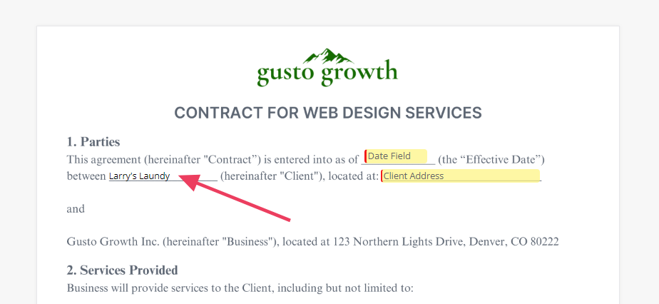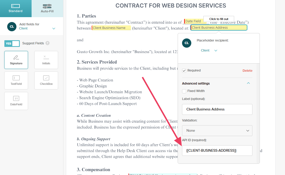 Let’s say your client’s business address should appear three times in a contract, and you want to automatically populate it in each place without requiring your client to enter it manually. Here’s how you’d set it up: