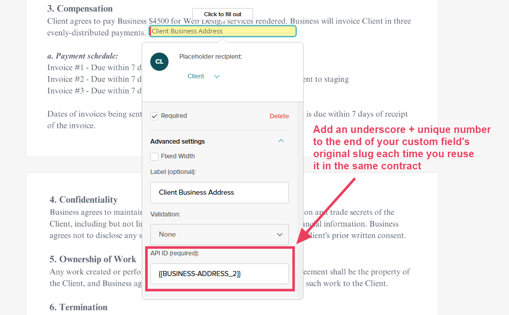 To populate the same custom field value multiple times in a single contract, follow the same setup process you'd use for any custom field—but with one key difference: each additional instance of the field must use a slightly modified slug by appending an underscore and a number (e.g., _2 , _3 , etc.).