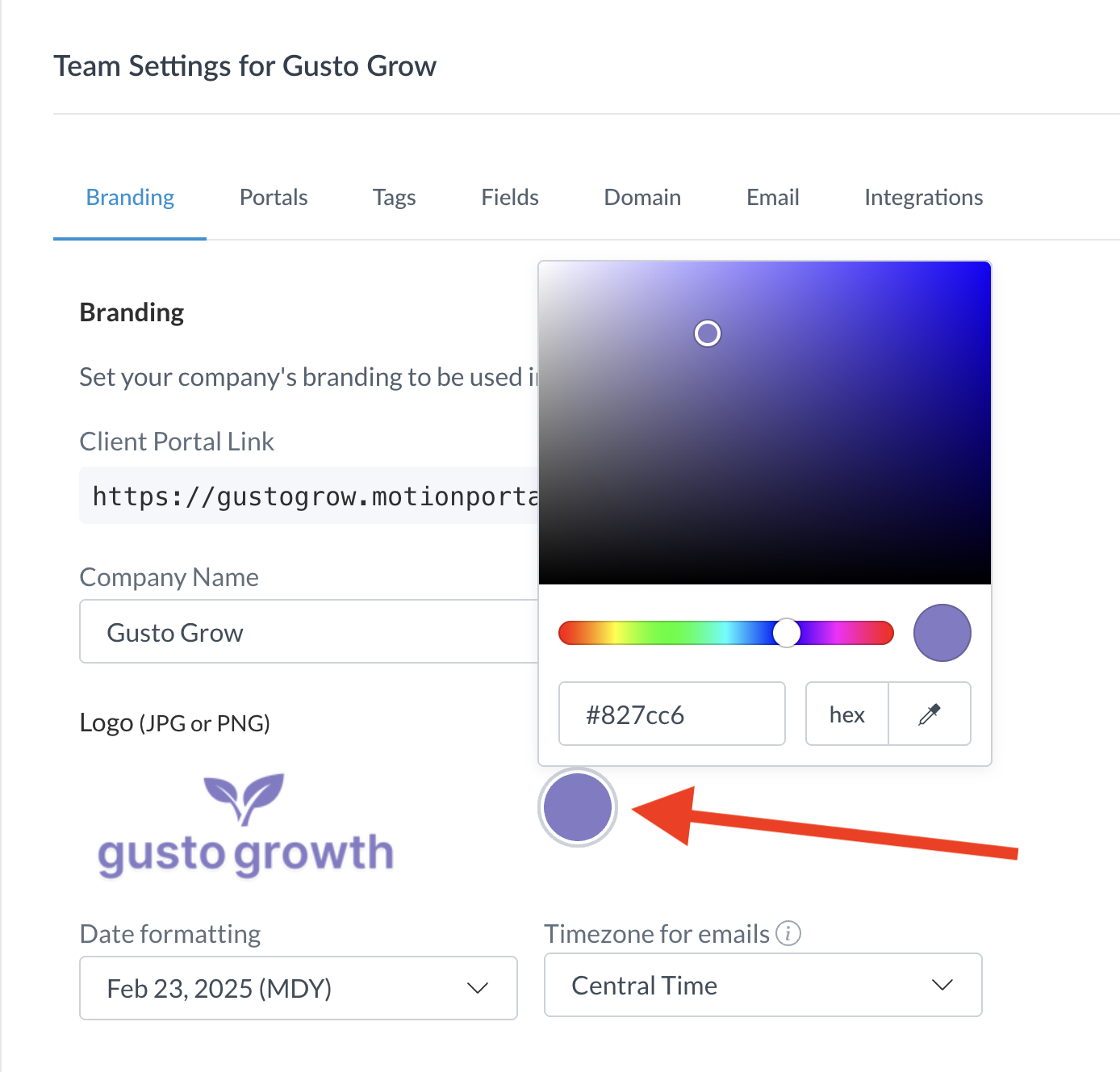 To select the primary color for your portals and emails, click the circle under "Primary Color." In the open modal, paste in a Hex Code or use the eyedropper tool to select the color you'd like from your logo.