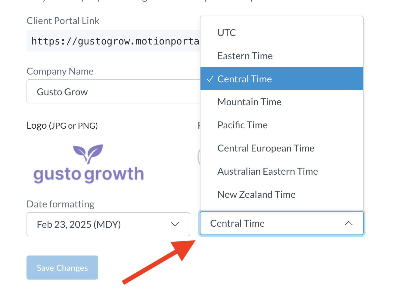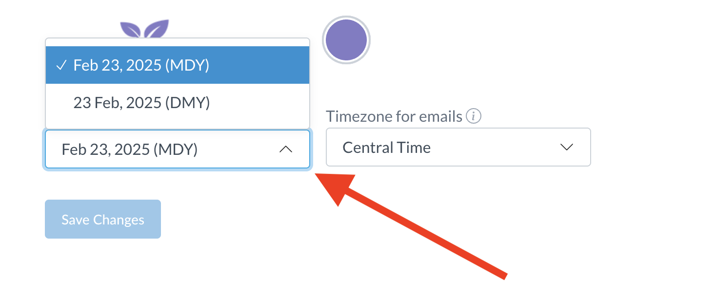 You can change the date format used for projects and client portals account-wide by selecting an option from the Date formatting dropdown.