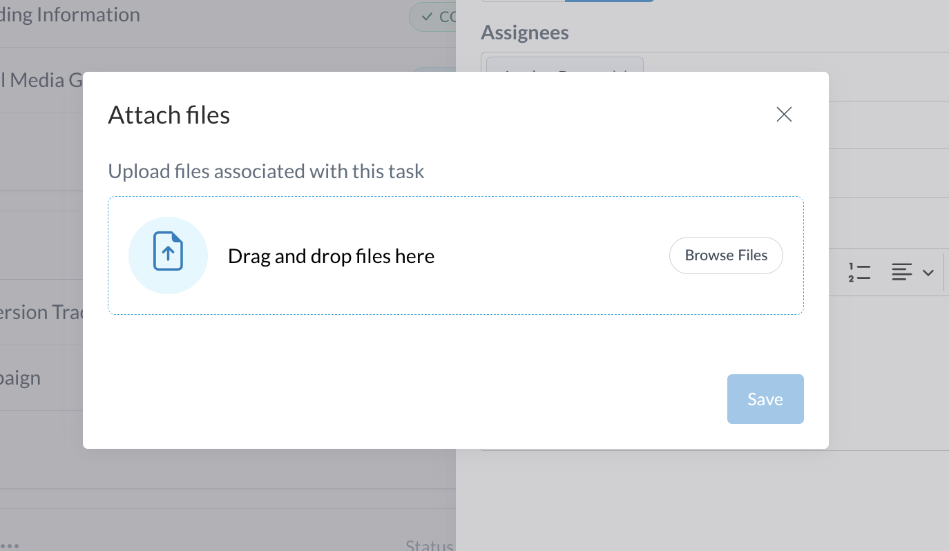In the modal that opens after clicking "Attach files," upload the file or files you'd like to share with your client or another team member.