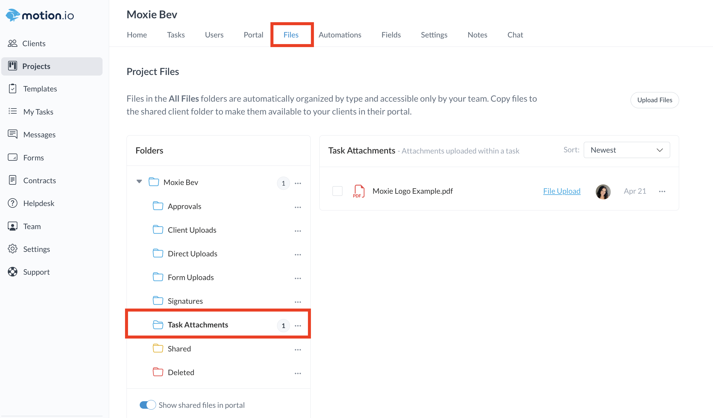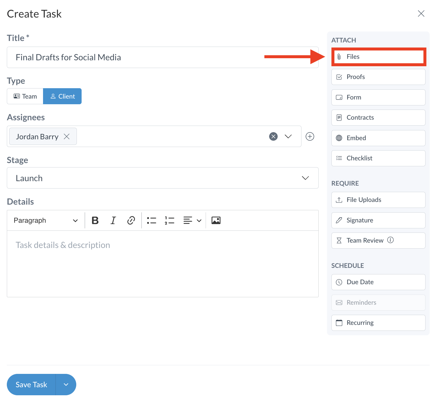 When creating client tasks, the Attach files task option enables you to attach all types of files and quickly send them to clients or team members for them to review and keep for their own records.