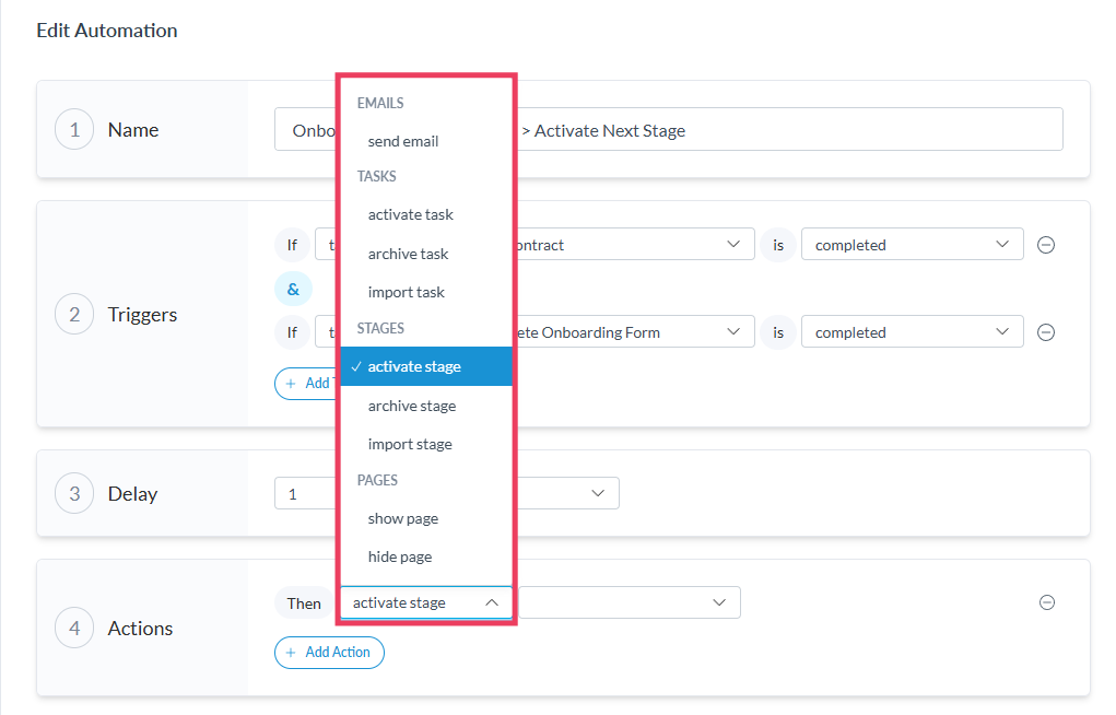 The final step before saving your automation is to define at least one action—what you want Motion.io to do automatically when the trigger conditions are met. Motion.io supports actions such as sending email notifications, activating or completing tasks, moving or updating stages, and showing or hiding portal pages.