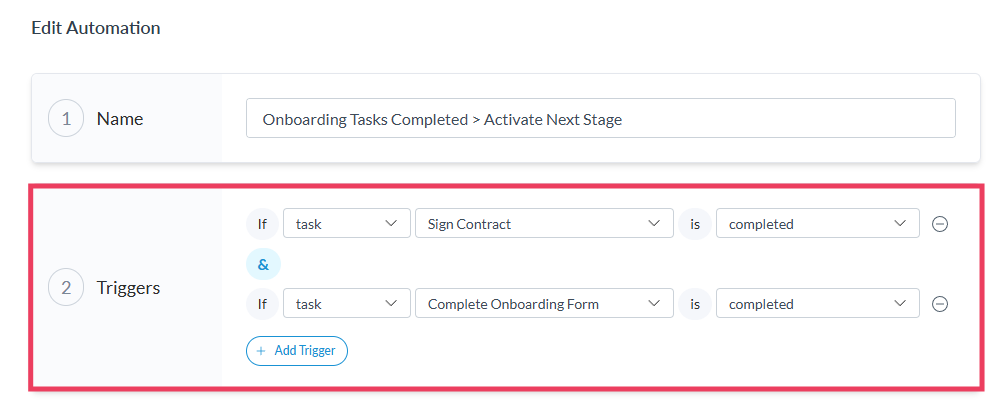 - A condition that must be met in the task, stage, or form block you referenced for the trigger to fire (for example, a specific task/stage being completed, activated, or archived)