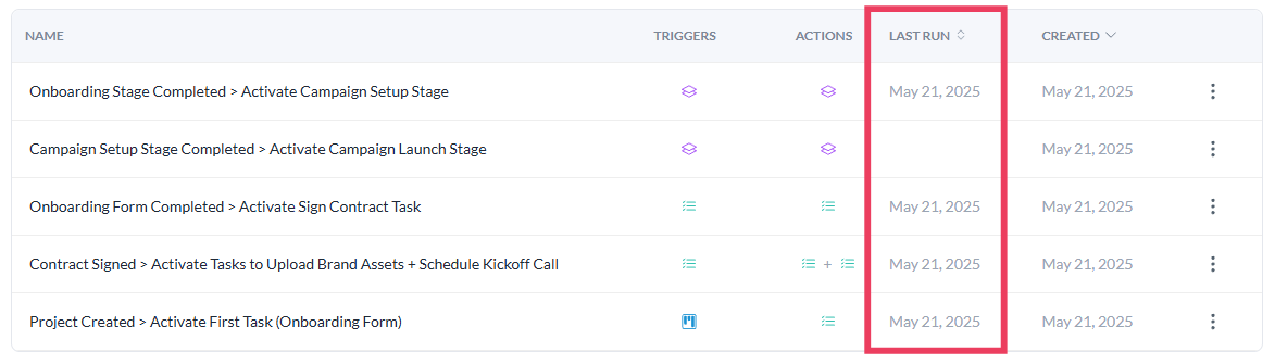 📣 Note: The date listed in the "Last Run" column applies only to automations that ran in that specific project. Because automations can only be triggered in active projects, the "Last Run" column of the automations overview in your templates will always remain blank.