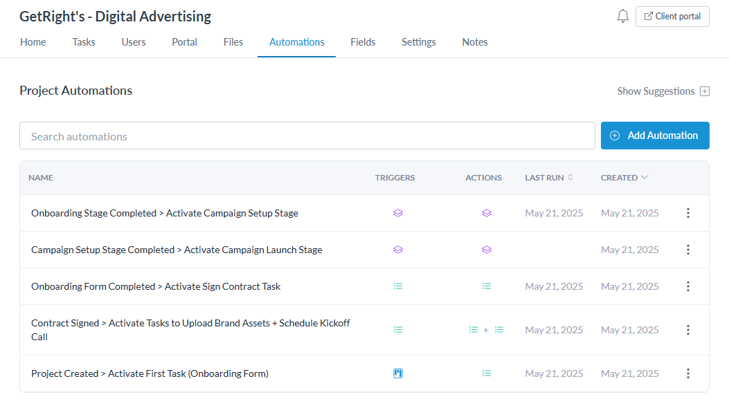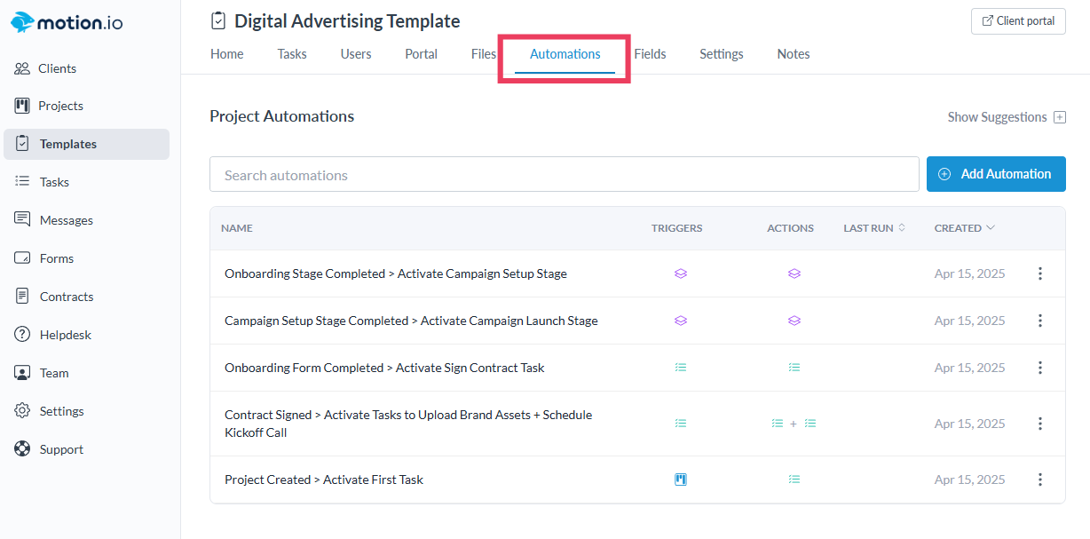 📣 Note: We generally recommend setting up automations within your Motion.io project templates. Automations added to a template will automatically carry over to any new projects created from it—saving you time and ensuring consistency without the need to start from scratch.