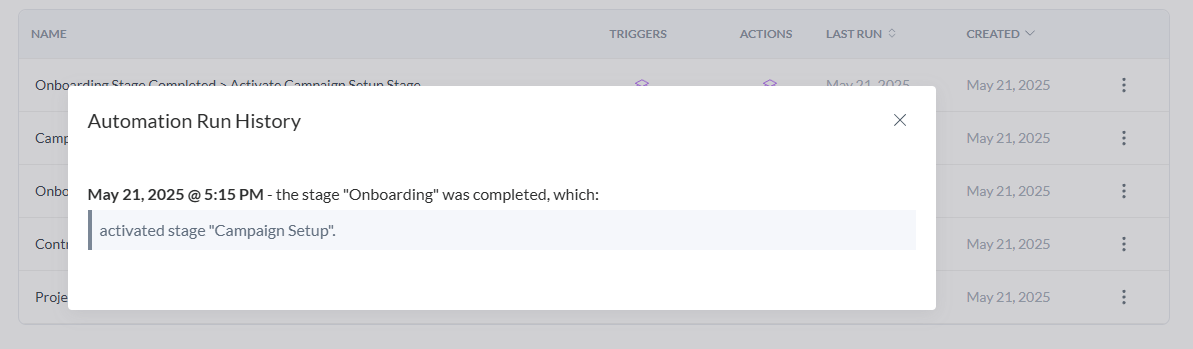 Clicking the date shown for an automation in the Last Run column will display additional details—such as the exact time it ran and which actions were executed. If no date appears, it means the automation hasn't run yet.