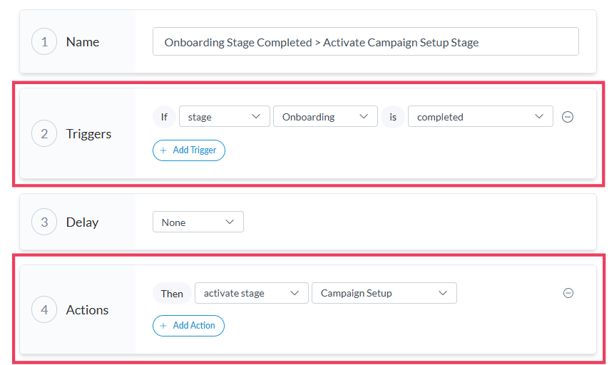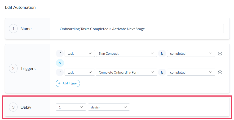 By default, the Delay field in new automations is set to “None.” To add a delay, simply enter a number and choose the time unit (hours, days, weeks, or months) from the dropdowns.