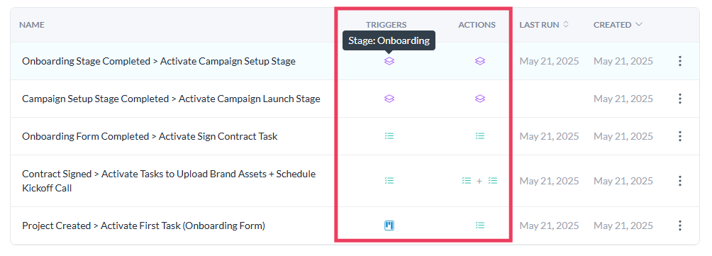 In the overview table, hovering over the icons in the Triggers and Actions columns lets you quickly see what type of trigger or action is being used, along with the specific task, stage, project, or form block it references.