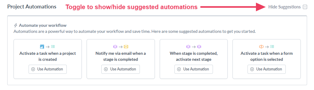 If you're new to automations, Motion.io provides pre-built templates to help you get started. To access them, click "Show Suggestions" and click "Use Automation" to add it to your project or template.