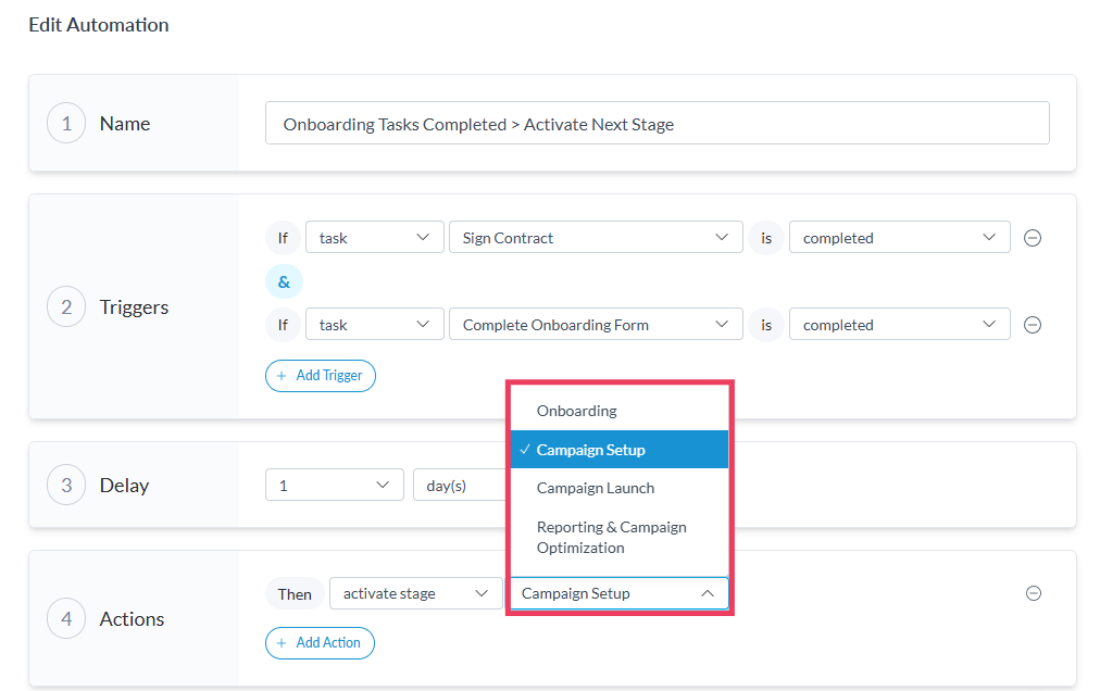 While optional, adding delays to your automation workflows can be especially helpful for projects with a defined timeline. Delays allow you to schedule actions more strategically—ensuring tasks and updates happen at the right moment in your project workflows.