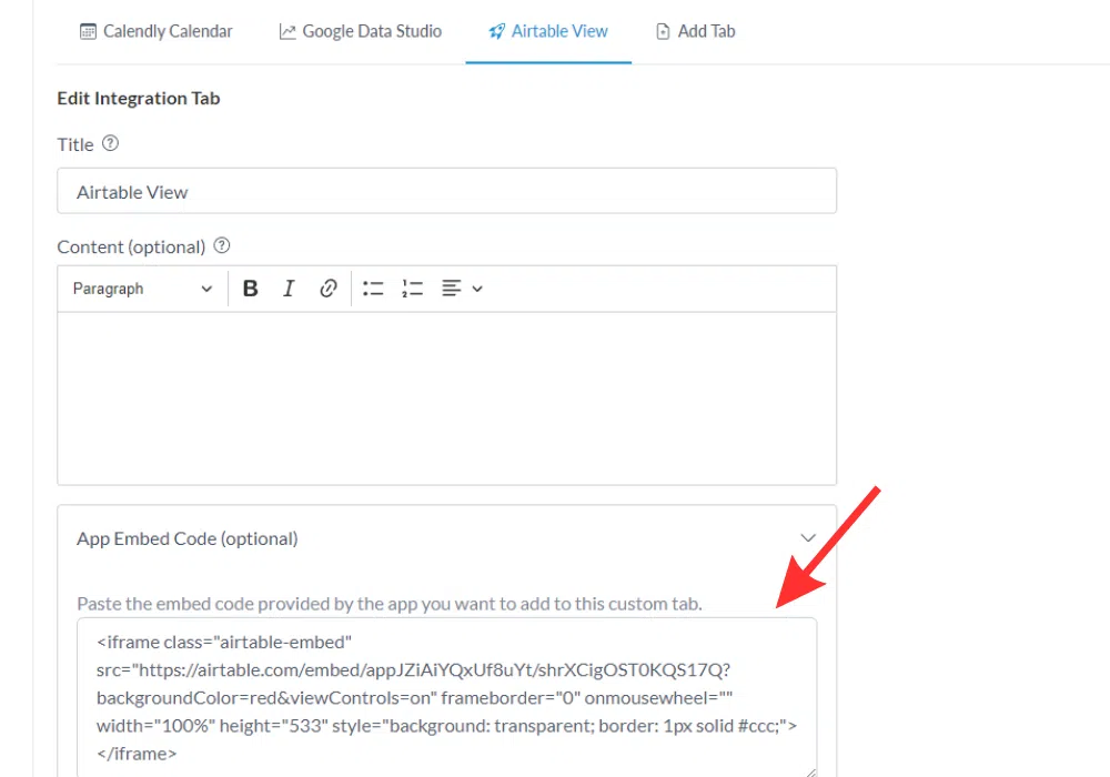 Finally, paste the embed code you copied from Airtable into the “App Embed Code” window near the bottom of the portal page editor.
