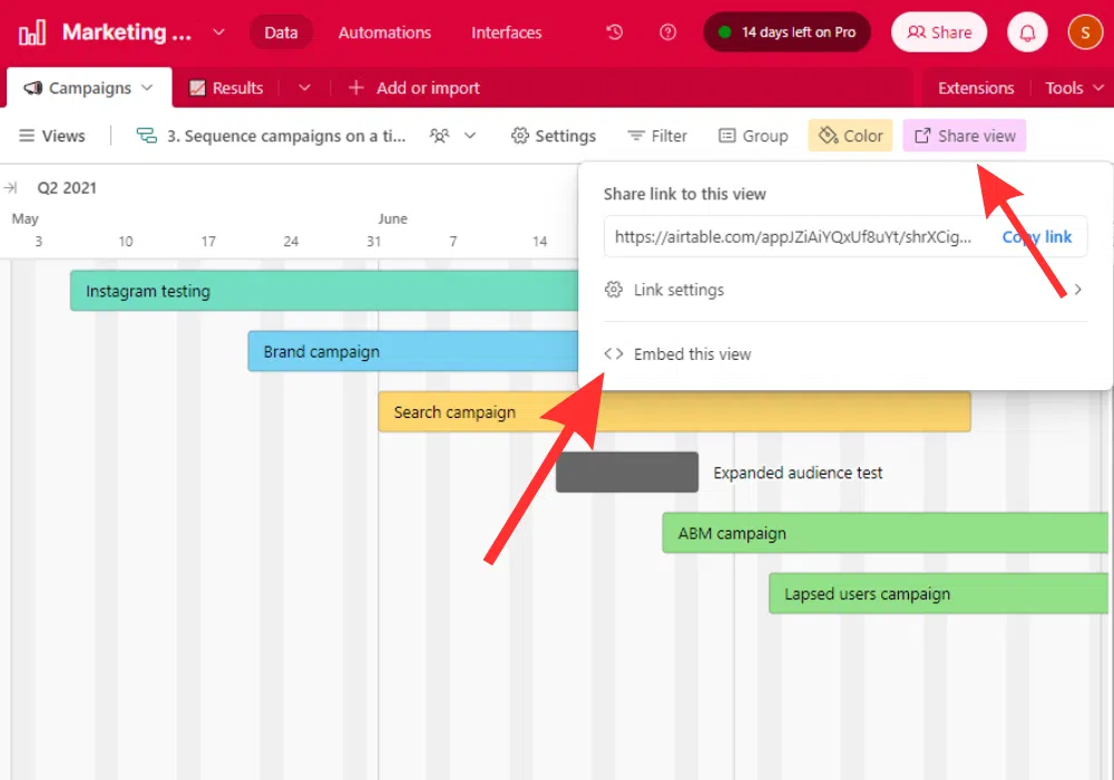 With the view you want to connect to Motion.io open in Airtable, click “Share view” and then “Embed this view.”