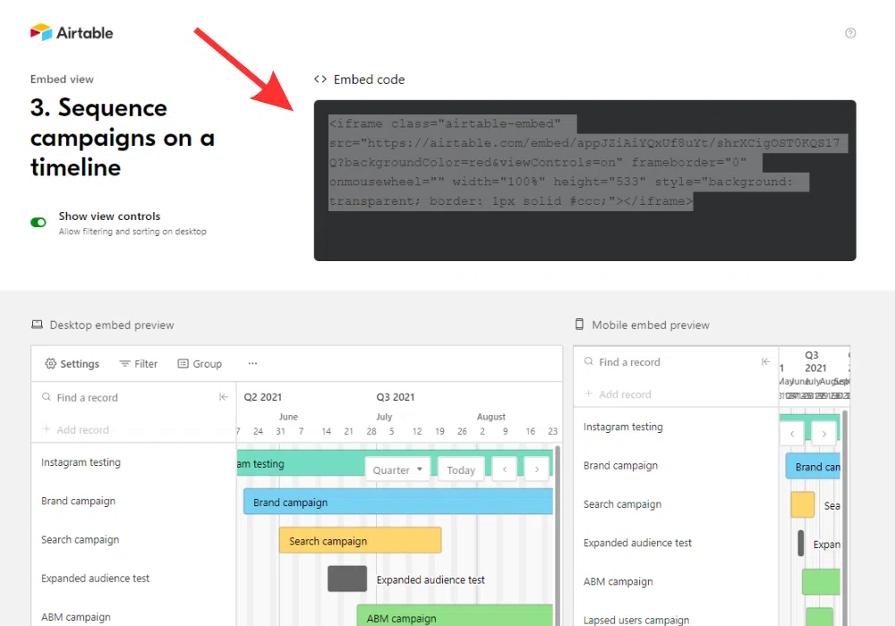 In the new tab that opens after clicking “Embed this view” in Airtable, copy the embed code.