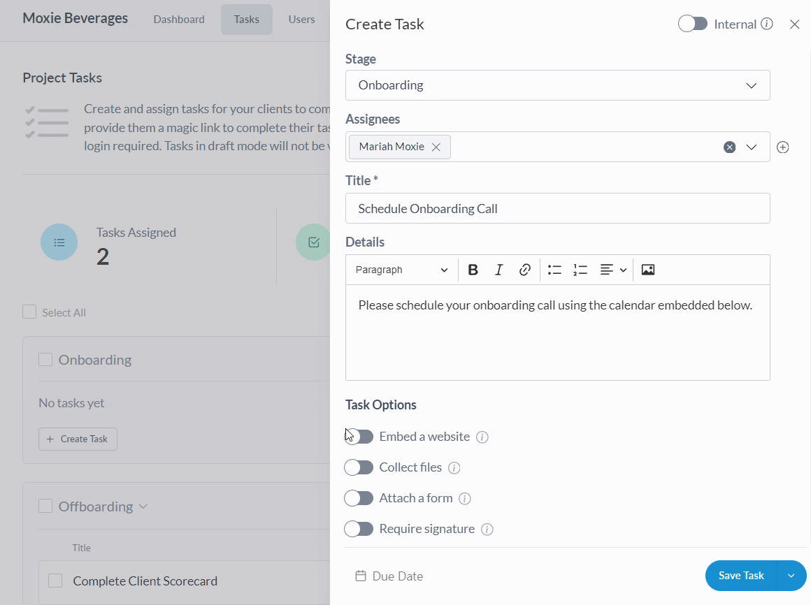 After entering a title (required) and description (optional) for your task, toggle on the “Embed a website” task option. Paste the embed code you copied in Step 3 into the open modal and click “Save.”