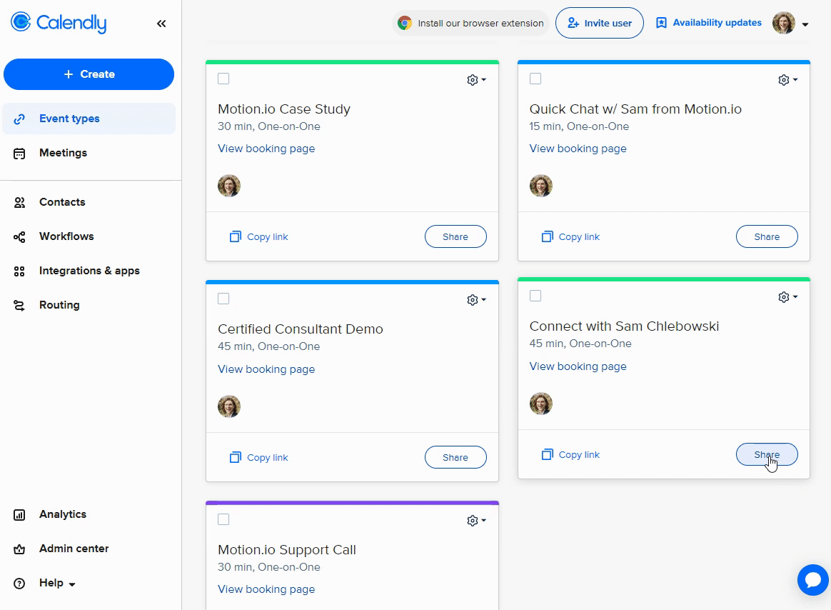 In your Calendly account, navigate to the “Event Types” screen and click the “Share” button on the calendar you want to connect to Motion.io. In the pop-up window, click “Add to website,” then “Inline Embed,” and “Continue.” Copy the Calendly embed code manually in the next window or click the “copy code” button.