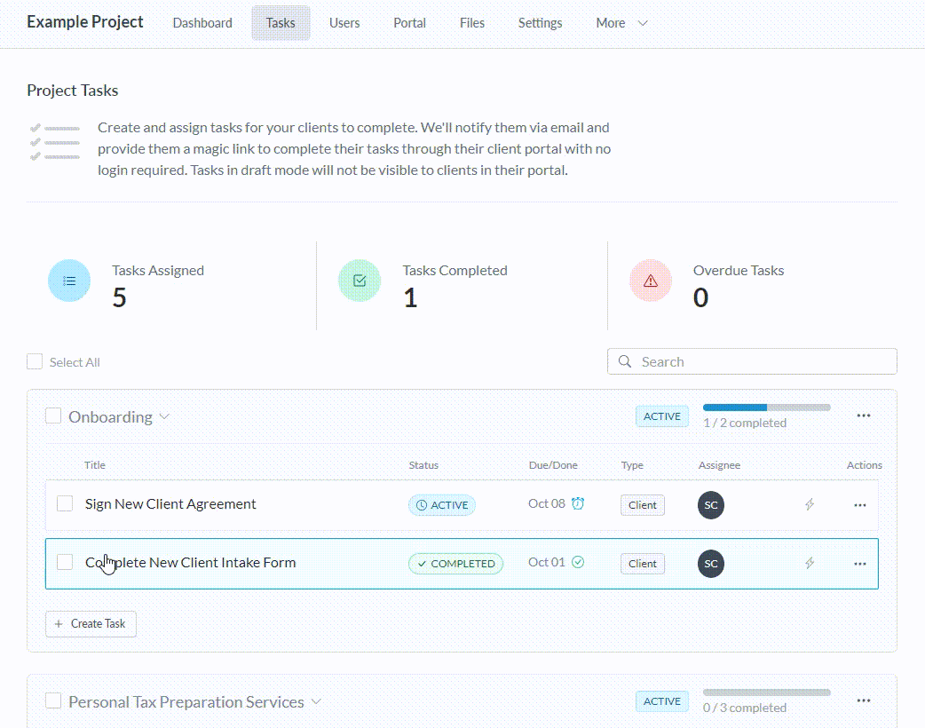 Note: To add a Fillout form to a portal page instead of a client task, select a project or template and click “Portal” in the top navigation menu. Click “Add New Page” and paste the code you copied in Step 2 into the “App Embed Code” section.