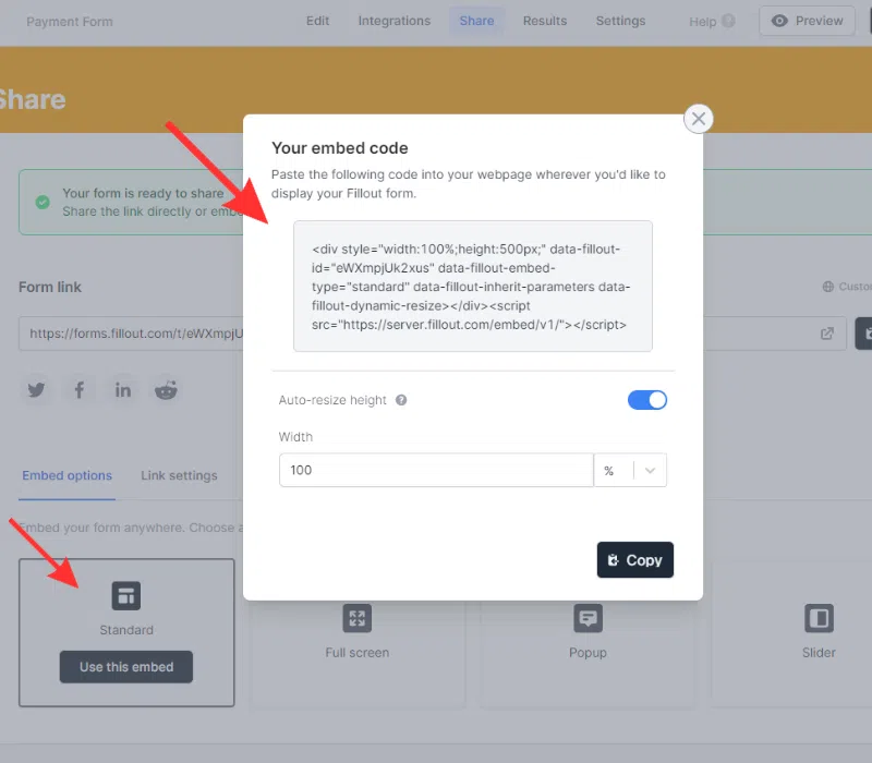 After clicking “Share,” click “Use this embed” under the “Embed options” tab of Fillout.