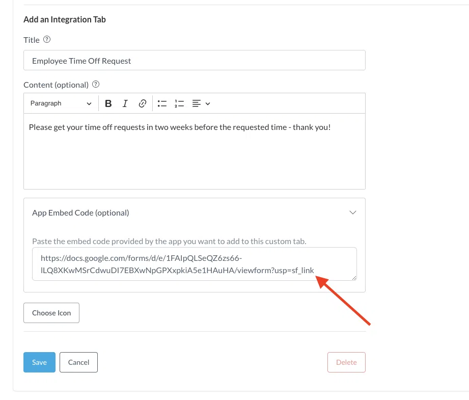 Finally, paste the generated link you copied from your Google Form into the “App Embed Code” window near the bottom of the portal editor. Click “Save.”