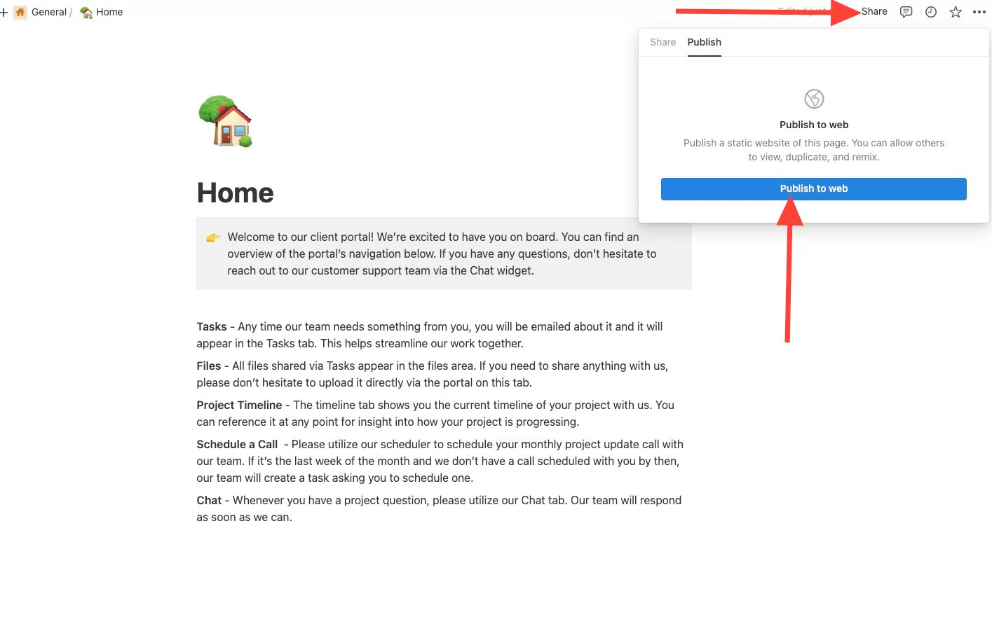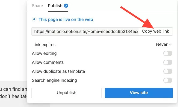 In your Notion account, publish the page you want to add to Motion.io by clicking Share > Publish > Publish to Web.