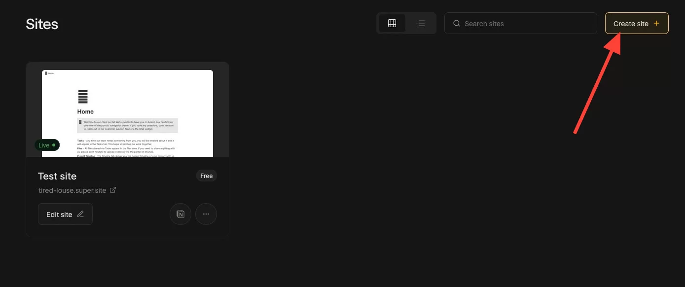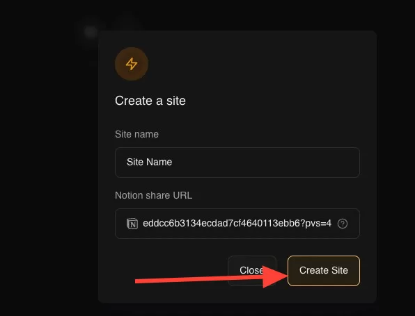 In the window that appears after clicking “Create Site” in Super.SO, enter a site name (note: site name is for internal use only) and paste the URL you copied in Step 3 into the “Notion share URL” section.