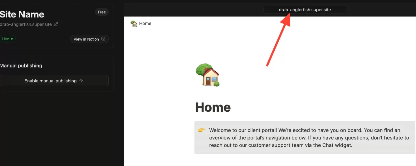 Once your site has been created in Super.SO, copy the URL that appears directly above the page content pulled in from Notion.