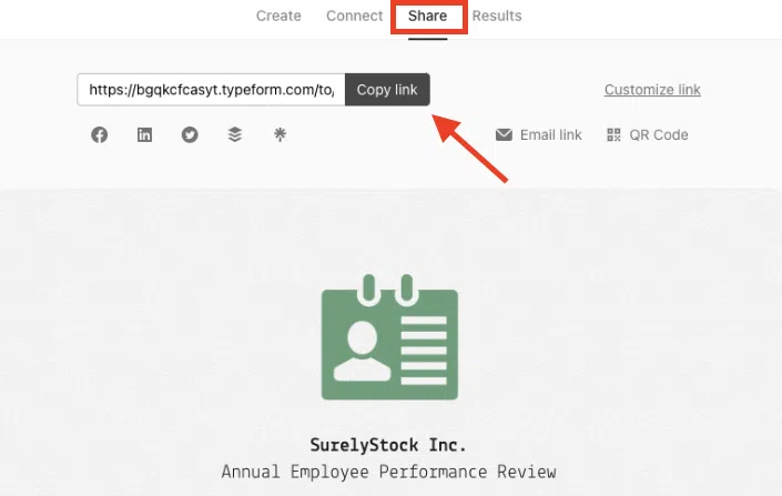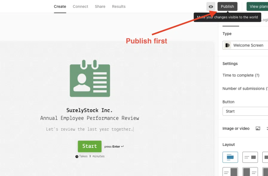 From your Typeform form, first “Publish” the form so that people can view your form without being logged in.