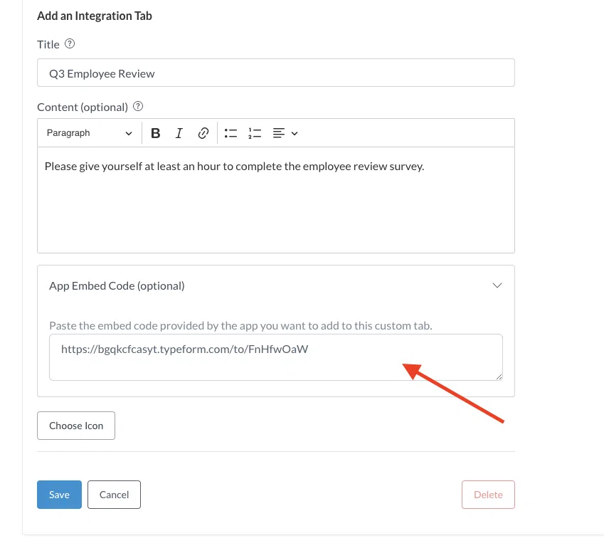 Finally, paste the generated link you copied from Typeform into the “App Embed Code” window near the bottom of the portal page editor. Click “Save.”