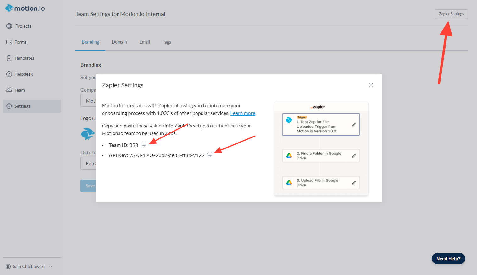Paste your Motion.io Team ID plus your Zapier API Key into Zapier authentication window you left open in step #1.