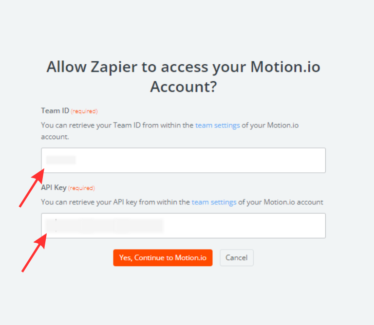After adding your Team ID and API Key to Zapier, click ‘”Yes, continue to Motion.io.”