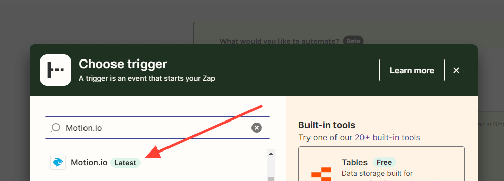 Should you see multiple versions of Motion.io’s Zapier integration, select the version labeled “Latest.” When you do, a window requesting your Motion.io Team ID and API key will open. Leave this window open.