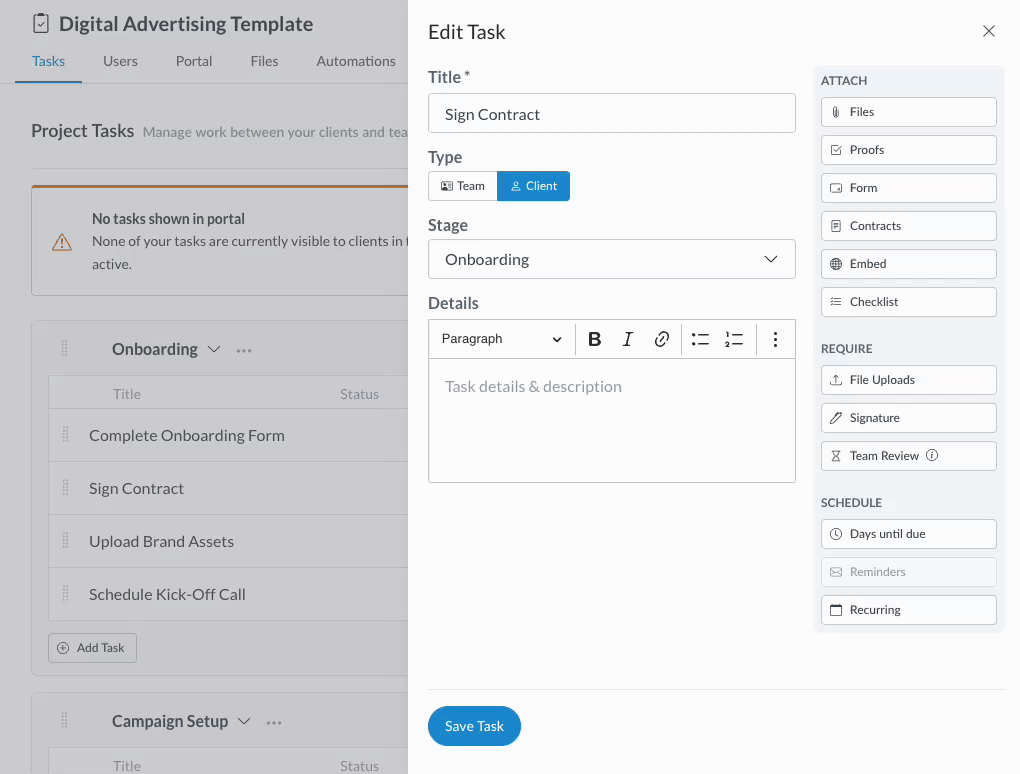 In addition to attaching electronically signable contracts to tasks within active projects, you can add them to tasks in project templates to further streamline and automate your client workflows.