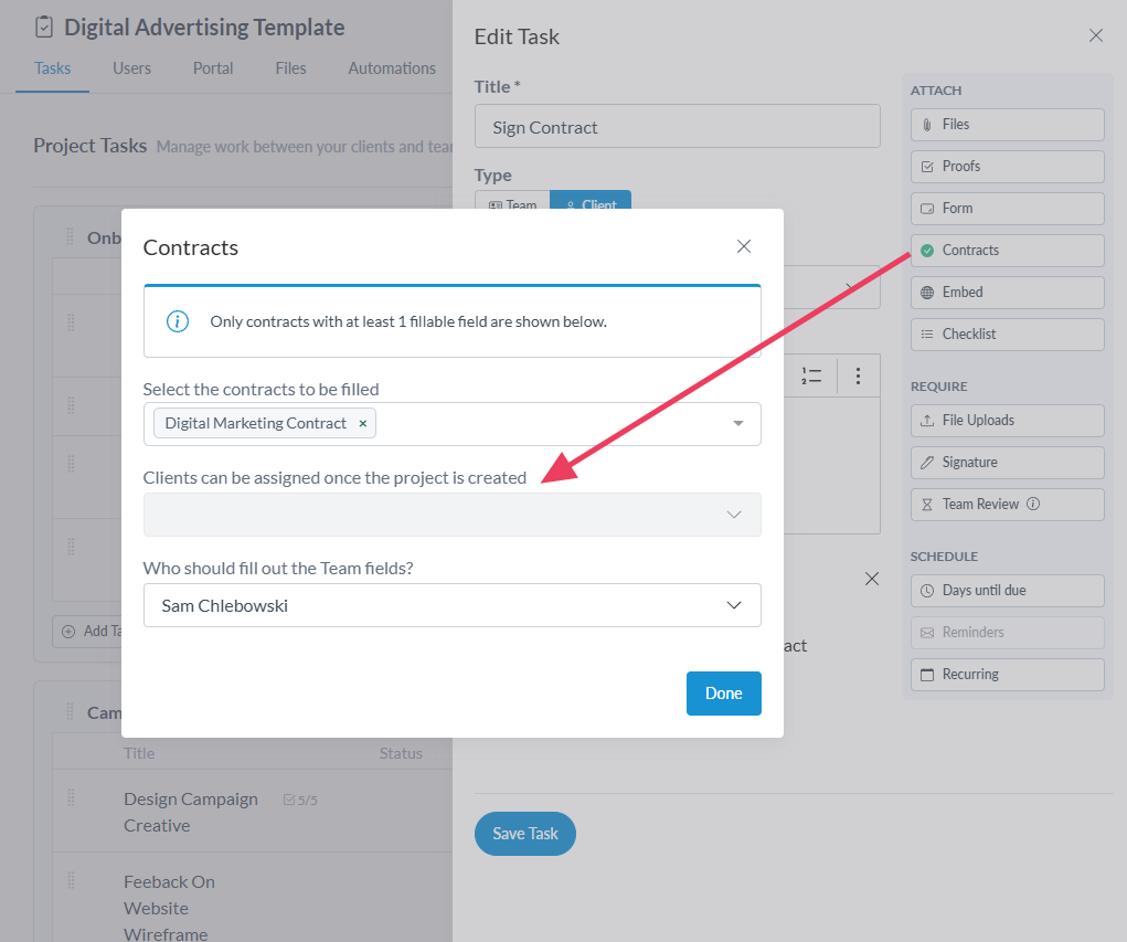 After creating a task in your template, click the "Contracts" task option, select your contract from the dropdown, enter any final details (like the number of days until the task is due, the project is created), and click "Save."