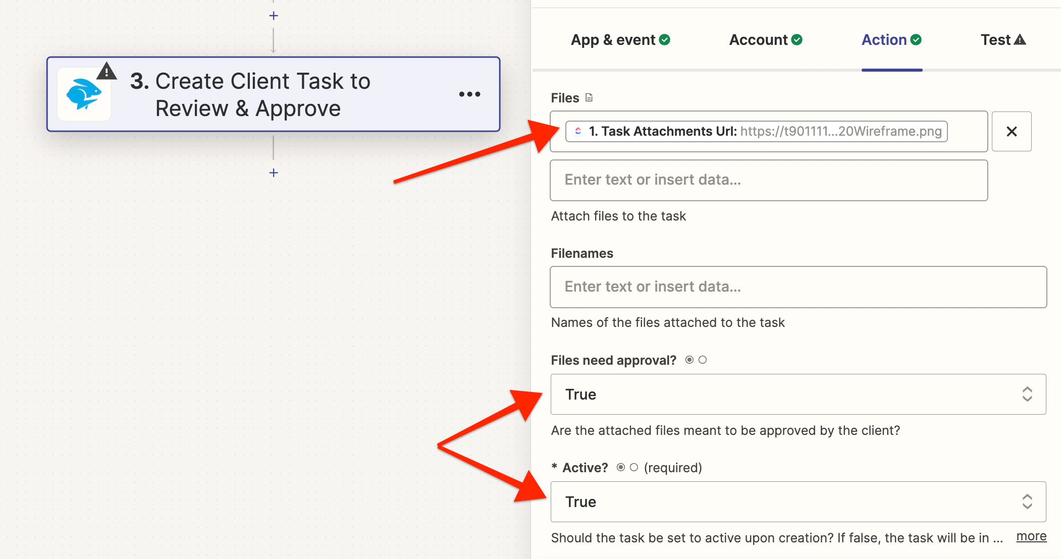 To accomplish this, the fields for this "Create Task" action in this Zap are configured as follows: