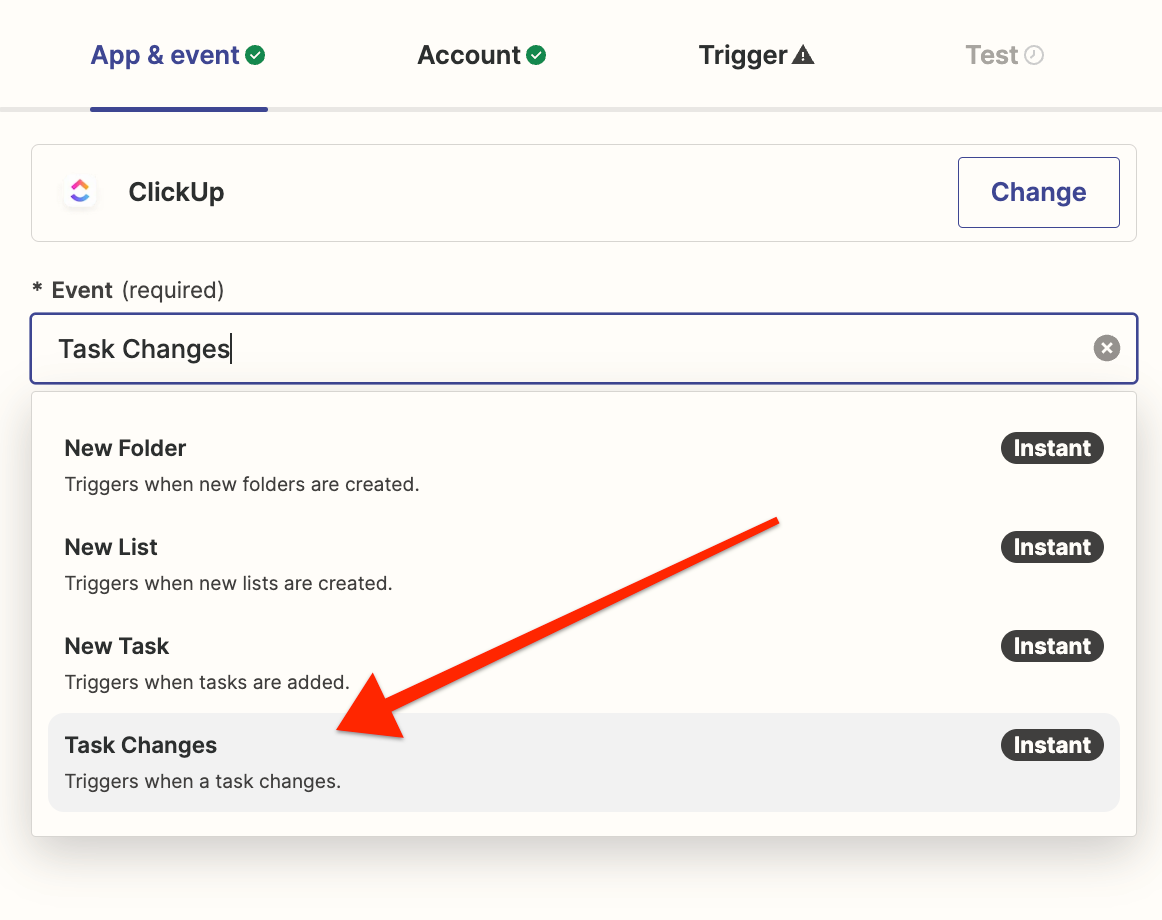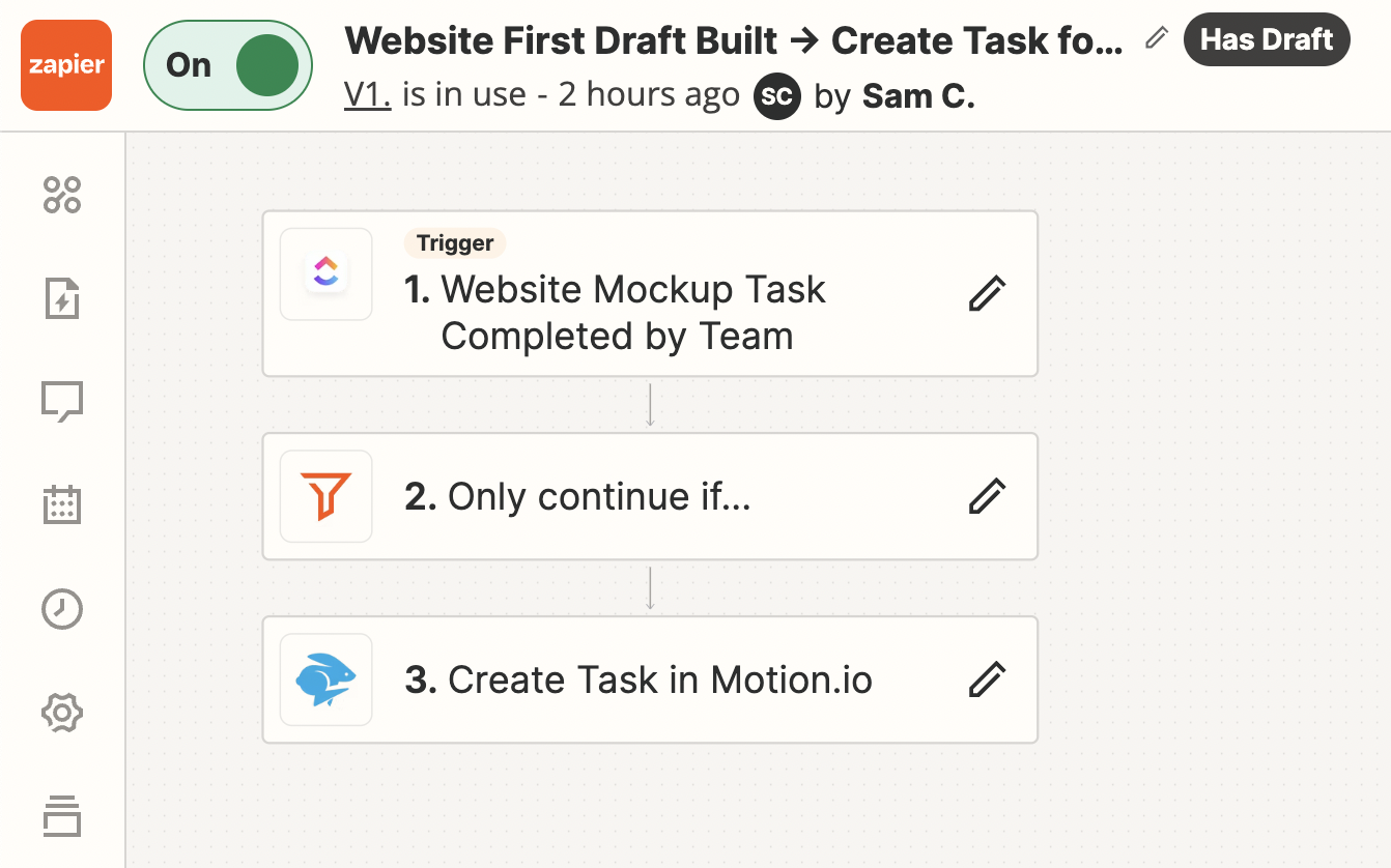 The screenshots below show an example of a Zap that automatically creates and assigns a client task in Motion.io after a team member completes a dependent task in ClickUp.