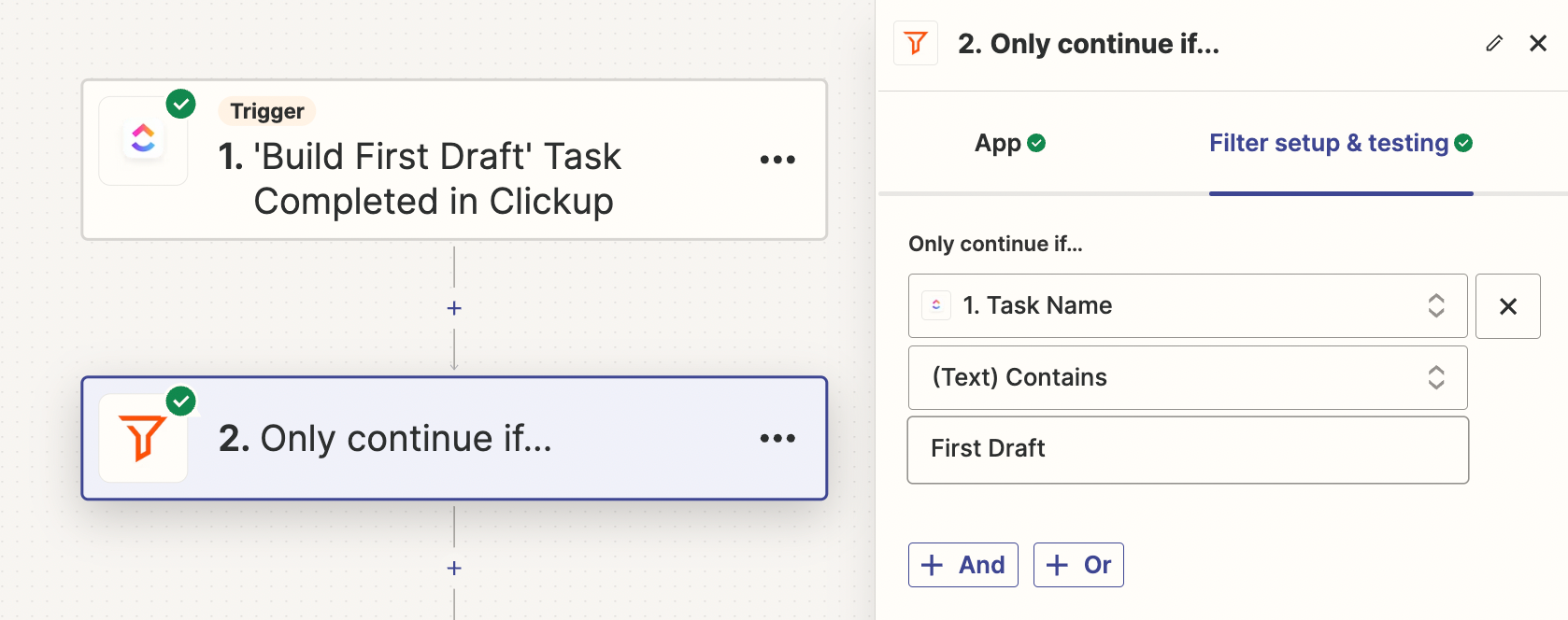The filter example below is configured so that the Zap will only continue to the next step (creating a client task in Motion.io) if the task completed in Clickup contains the words "First Draft."