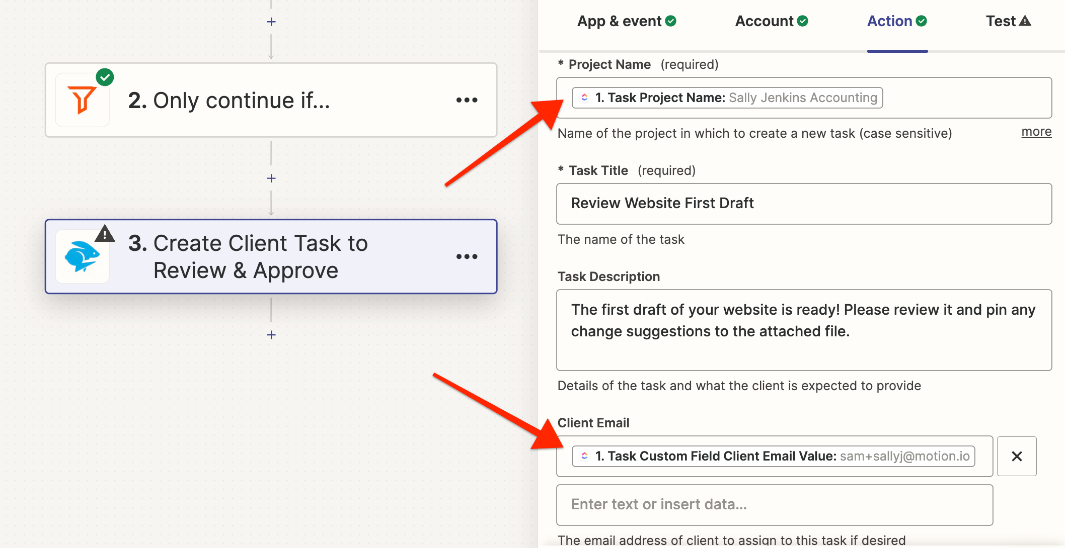 The example action (shown below) is configured to create a task in Motion.io for the client to review and approve the first draft of their website after a corresponding task to create the first draft is marked as complete in ClickUp.
