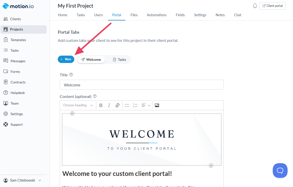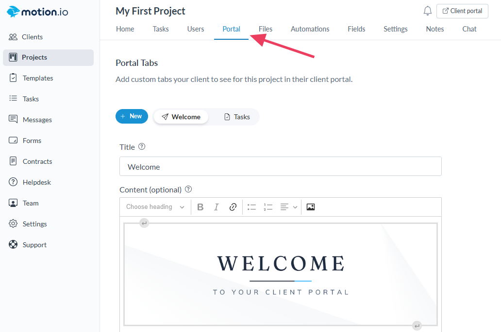 In addition to editing or removing the default tabs, Motion.io allows you to create new project tabs to provide clients with access to static information or connected software applications they'll need throughout a project.
