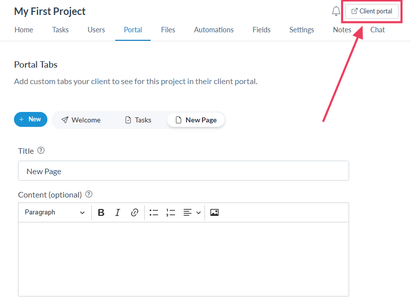 After saving changes made to a project tab or tabs, click "Client portal" at the top to see a preview of how the portal and any custom tabs you added will appear to the client.