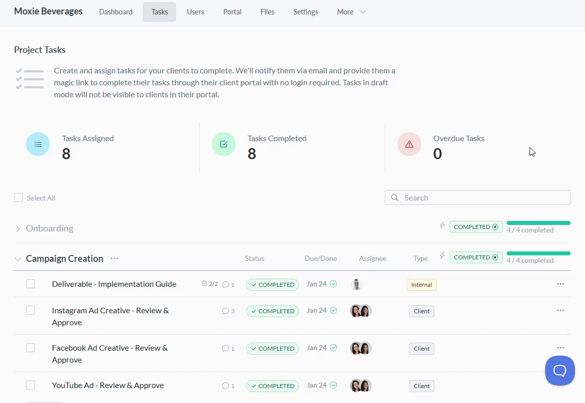 When creating client tasks, the Attach files task option enables you to attach all types of files and quickly send them to clients to view, annotate, and approve directly in their Motion.io portals.