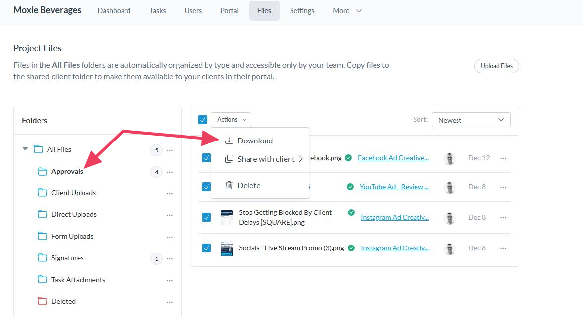 In a project where the client has approved one or more files (and the task(s) related to those are marked "Complete"), click on "Files" from the top navigation menu.