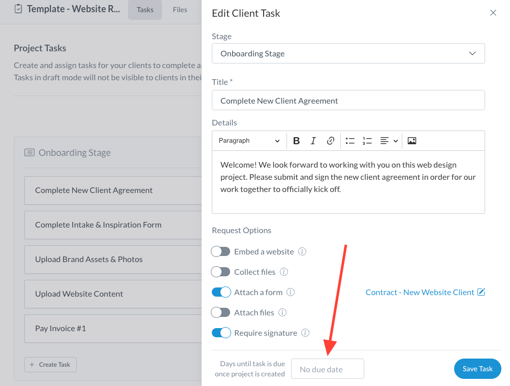 Next, add a due date for the task by entering a number into the field that appears to the left of the "Days until task is due once project is created" label at the bottom of the task composer.