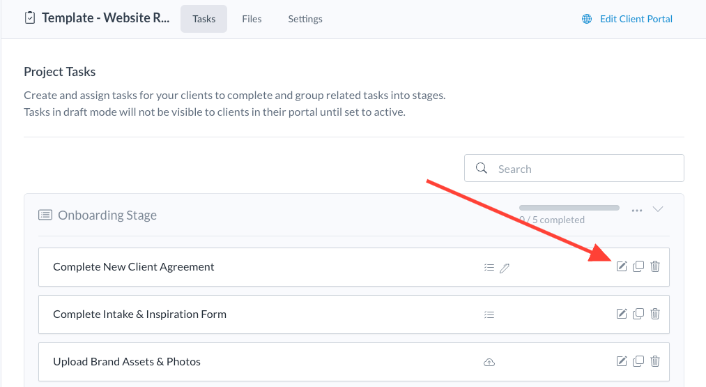 In addition to adding due dates and reminders for client tasks in your active Motion.io projects, you can assign due dates and reminders to client tasks in your project templates.