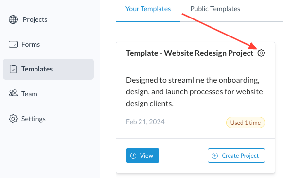 To access tasks in a project template, select the "Templates" option on the left side of your account and click the gear icon in the upper right corner of the template you want to edit.